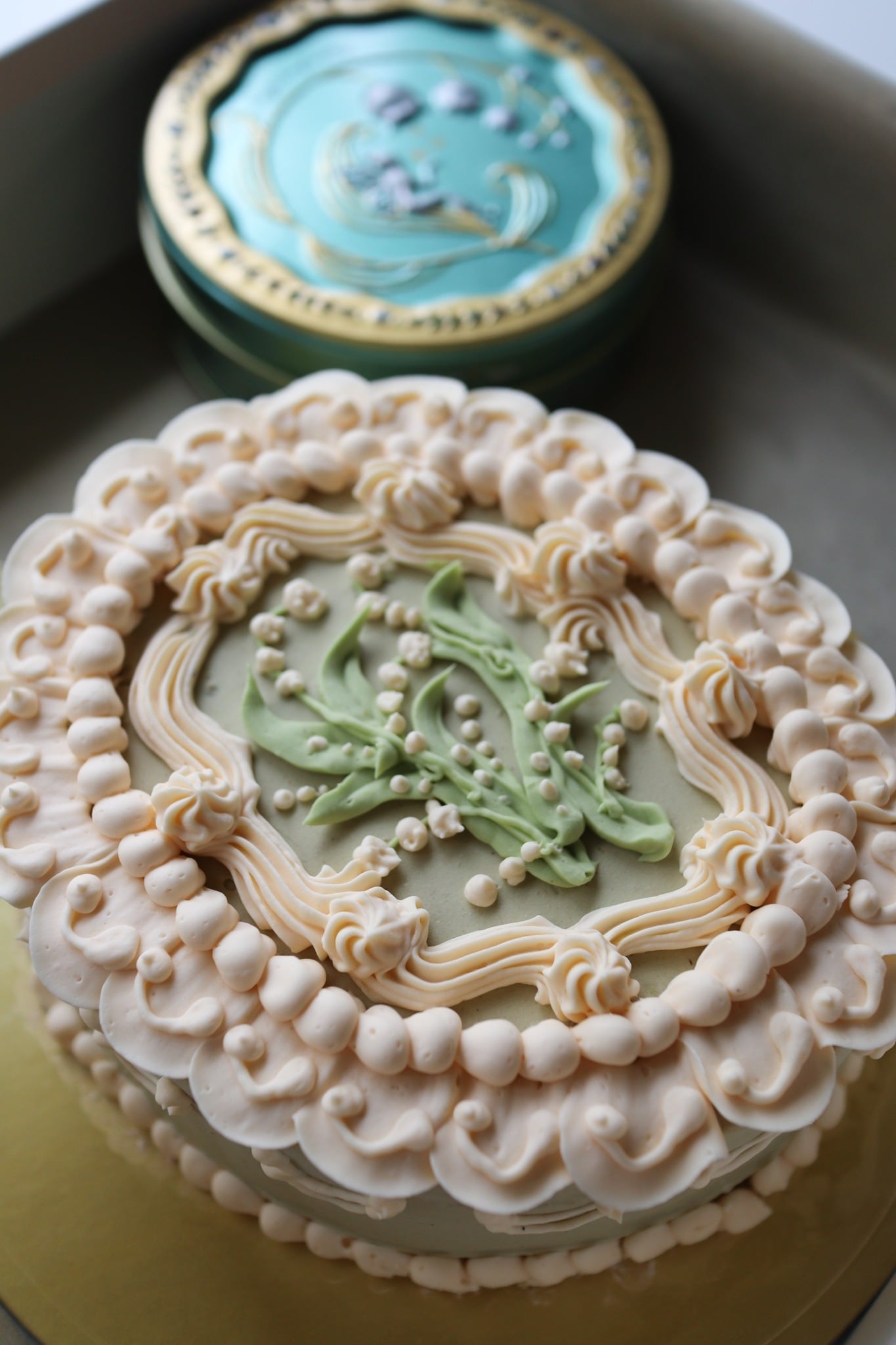 思わず見とれてしまう繊細で細やかなデコレーション。上品なグリーンはピスタチオナッツのペーストを使用した自然な色合いです