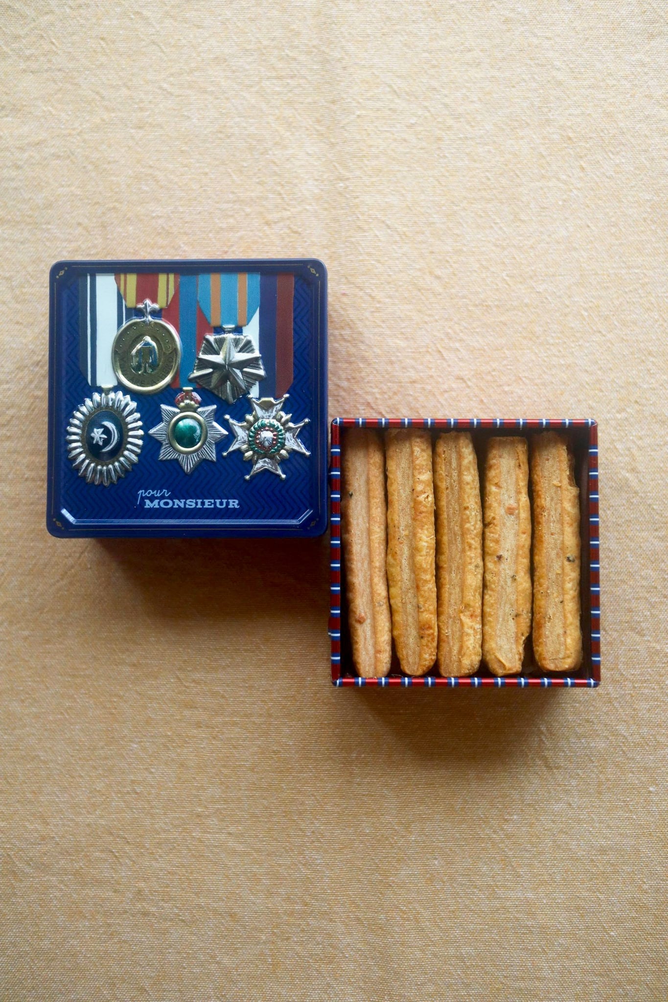 *なつかしく、親しみある味わいのチーズクッキー。コンパクトな手のひらサイズのカッコイイ勲章デザイン缶にお詰めしています