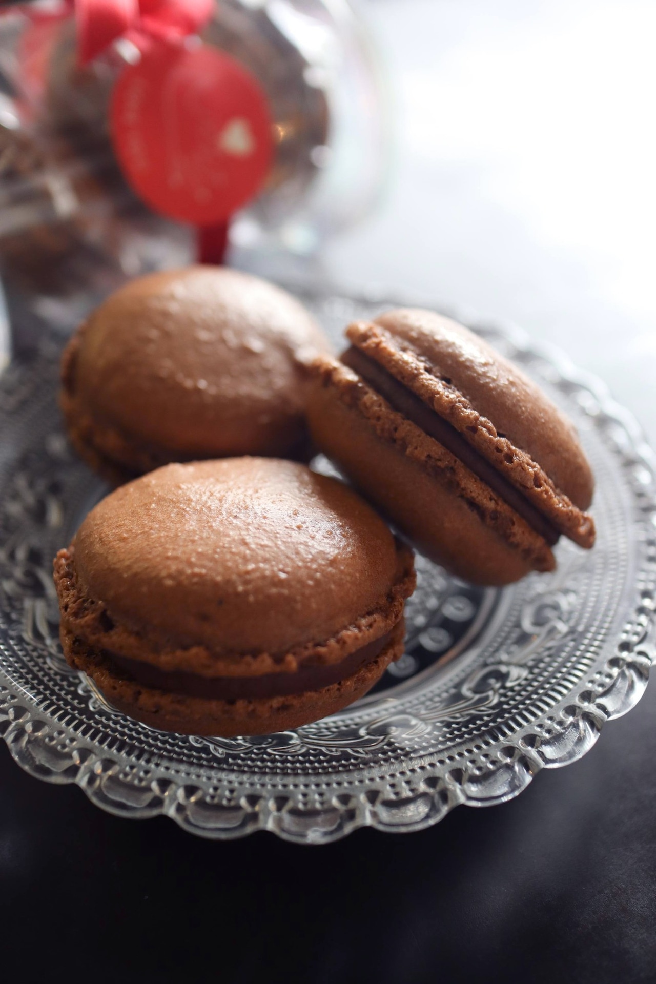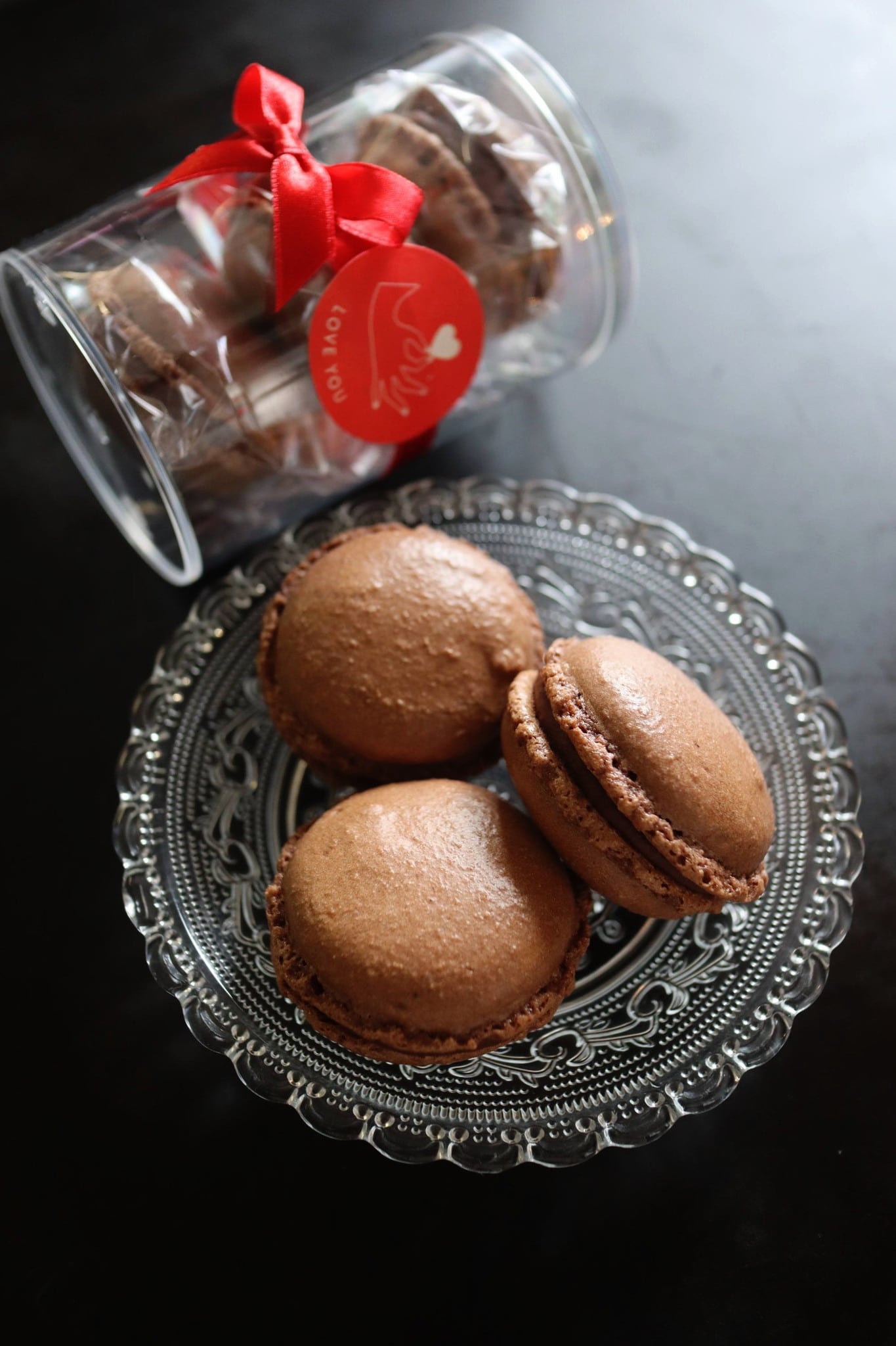 *マカロンはバレンタイン限定!ショコラ3ケ入りでお届けします。マカロンのアーモンドの風味とガナッシュクリームのなめらかなくちどけが贅沢な味わいです