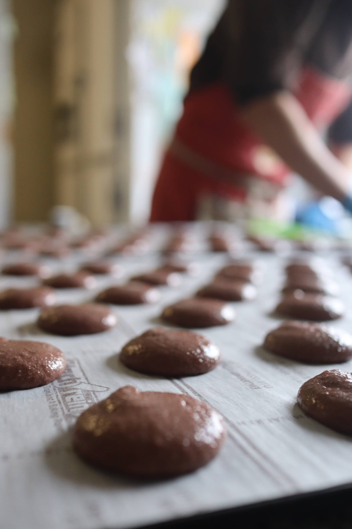*卵白、アーモンドプードル、砂糖とほんの少しの彩りを加えて作るシンプルな配合のマカロン生地。生地づくりから、絞り、焼き上げまでひとつひとつ手仕事で仕上げていきます
